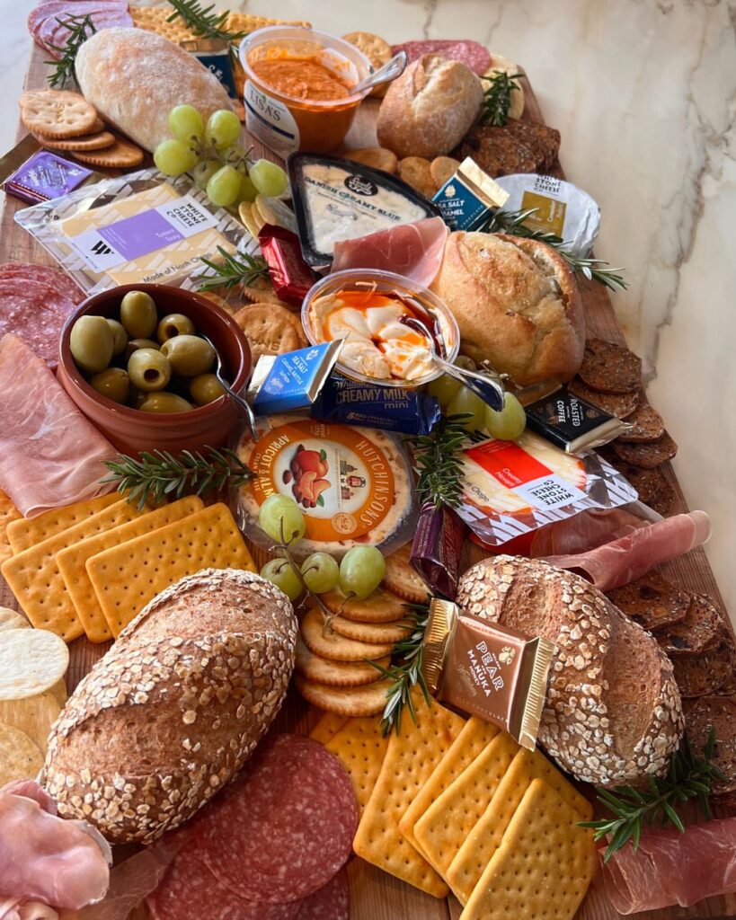 Enjoy a beautifully arranged grazing platter featuring a selection of cheeses, cured meats, fresh fruits, dips, and artisan accompaniments.